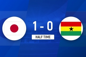 伤停补时1分钟。上半场比赛结束,日本1-0加纳。
